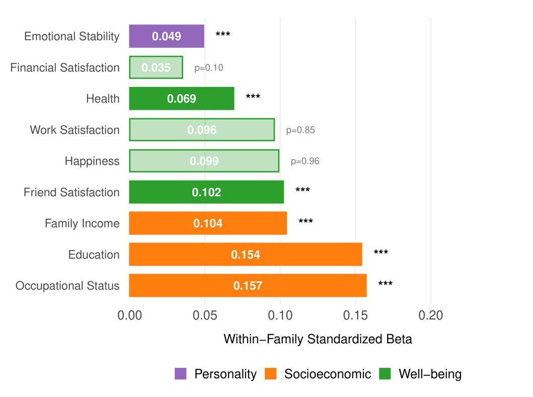 In a 1997 editorial in the journal Intelligence, Linda Gottfredson defined general intelligence as “a very general mental capability that, among other things, involves the ability to reason, plan, solve problems, think abstractly, comprehend complex ideas, learn quickly and learn from experience.” She noted that “it reflects a broader and deeper capability for comprehending our surroundings – ‘catching on,’ ‘making sense’ of things, or ‘figuring out’ what to do.” If a polygenic score is truly capturing this construct, its effects should not stop at the boundary of a cognitive test. It should predict how people navigate the real world. And it should do so within families, where siblings share the same parents, the same household, the same school district, and the same socioeconomic starting point.