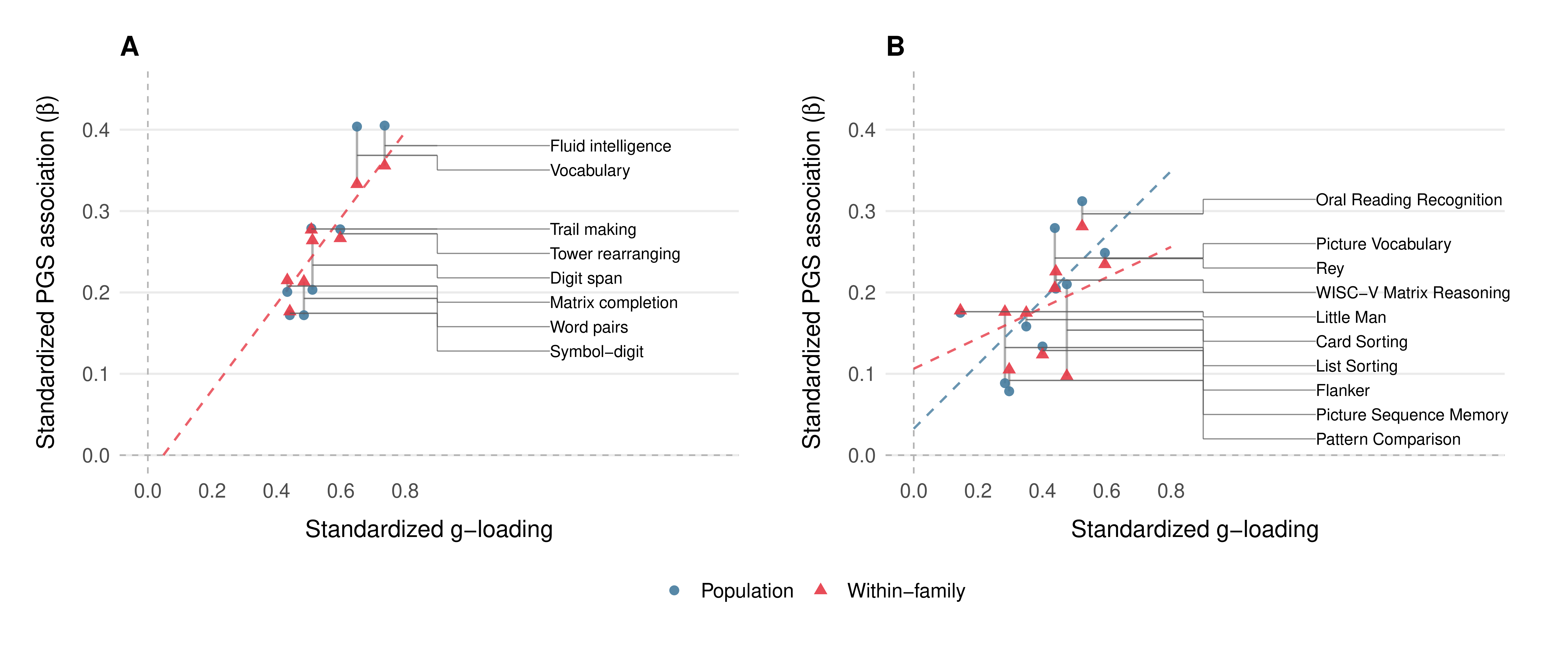 Finally, based on a reviewer’s feedback, we checked whether the score’s predictive power was concentrated where it should be. If CogPGT genuinely measures general cognitive ability rather than some narrow skill, it should predict g-loaded tests more strongly than less g-loaded tests. This is exactly what we observe. Across the eight cognitive indicators in UKB, the correlation between each test’s g-loading and its PGS association is 0.97 at the population level and 0.93 within families. The score tracks general ability with near-perfect fidelity: fluid intelligence and vocabulary (the most g-loaded tests) show the strongest PGS associations, while less g-loaded tasks like symbol-digit substitution show the weakest. In ABCD, point estimates are lower (population r = 0.66, within-family r = 0.46) but come with wide confidence, so they should not be overinterpreted. The overall pattern is clear: the score does not accidentally predict processing speed, or reading ability, or any other narrow cognitive domain. It predicts g, and the tests that are better measures of g are the ones it predicts best.