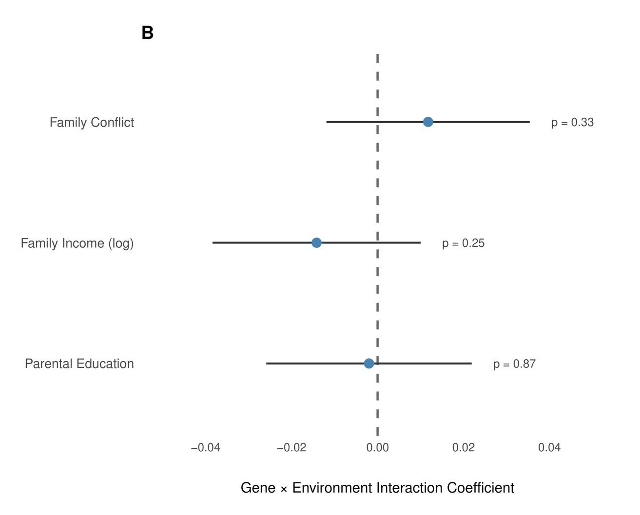 Our findings align in that sense with the literature: We examined interactions between the PGS and three key environmental moderators in the European-American subset of ABCD (N ≈ 5,000–5,700): Parental education was measured as the average years of schooling across both parents (N = 5,032, p = 0.87). Family income was the natural log of combined household income (N = 5,395, p = 0.25). Family conflict was assessed using the parent-reported Family Environment Scale conflict subscale, which captures overt disagreement and hostility within the household (N = 5,670, p = 0.33). None approached significance.