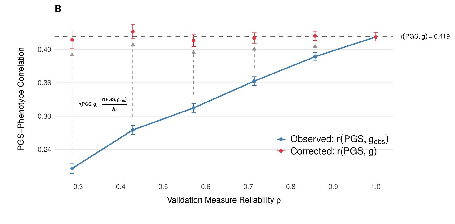 Classical test theory, which psychologists have understood for over a century, tells us that measurement error attenuates observed associations. If you measure someone’s true ability with error, the correlation between your noisy measurement and anything else (including their genotype!) will be smaller than the true underlying correlation. The noisier the test, the more the association shrinks.