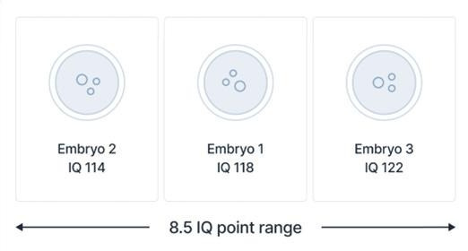 What does this translate to in practice? In the IVF context, embryos from the same two parents are genetic siblings, so within-family validation is the operative benchmark. The expected gain from selecting the highest-scoring embryo depends on how many are available and on ancestry. For European-ancestry parents choosing among 5 embryos, the expected IQ spread between the highest- and lowest-scoring embryos is roughly 10 points, rising to about 13 with 10 embryos and approaching 18 with 20. For East Asian ancestry, the corresponding values are approximately 8, 10, and 14 points. For African ancestry, where the current score retains about two-thirds of its European-ancestry accuracy, the expected spreads are roughly 6, 8, and 10 points. These are expected values across many selections, not guarantees for any individual case, and they assume the embryos are otherwise equivalent on criteria the parents care about.