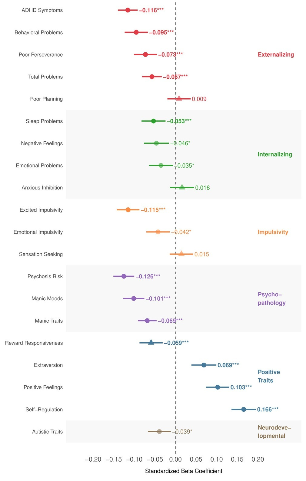 We ran a pleiotropy scan across 20 psychological and neurodevelopmental outcomes in ABCD. Higher CogPGT scores were associated with fewer psychotic-like symptoms, lower ADHD symptoms, reduced externalizing behaviors, fewer sleep problems, and higher positive affect. We found no significant positive association with autistic traits, the direction is actually weakly negative, which contradicts concerns derived from genetic correlation estimates. Due to small sample size, these are between-family associations and should be treated as directional rather than causal for now.