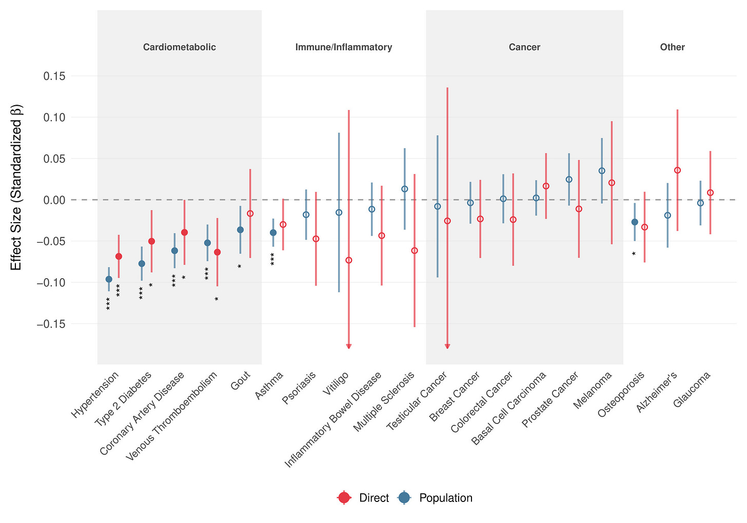 The story extends to physical health. Within up to 17,661 UKB sibling sets, higher CogPGT scores show direct protective associations against cardiometabolic conditions, including type 2 diabetes, and coronary artery disease and no positive association with any disease outcome. In contrast to the mental health results in ABCD, these estimates are actually all validated within-family and therefore overall likely causal.