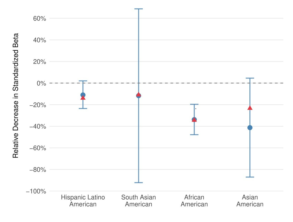 Polygenic prediction accuracy decreases with genetic distance from the training data, which remains predominantly European. CogPGT follows this expected pattern. In ABCD, stratified by ancestry, it retains roughly 89% of its effect size in Hispanic/Latino Americans, 88% in South Asian Americans, 64% in African Americans, and 59% in East Asian Americans.