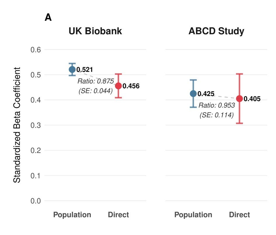 Researchers typically look at the ratio of effect sizes between population and sibling analysis to quantify the reduction in predictive performance. As we have previously shown for many diseases, this ratio is not significantly different from one, but for more cultural traits like educational attainment, large effect reductions of up to 50% have been observed. In the UK Biobank, we observe an attenuation ratio of about 0.88. The vast majority of the signal therefore survives. In the ABCD cohort of 9–10 year olds, the score retains around 96% of its predictive power within families. However, due to a smaller sample size, the uncertainty around that estimate is larger.