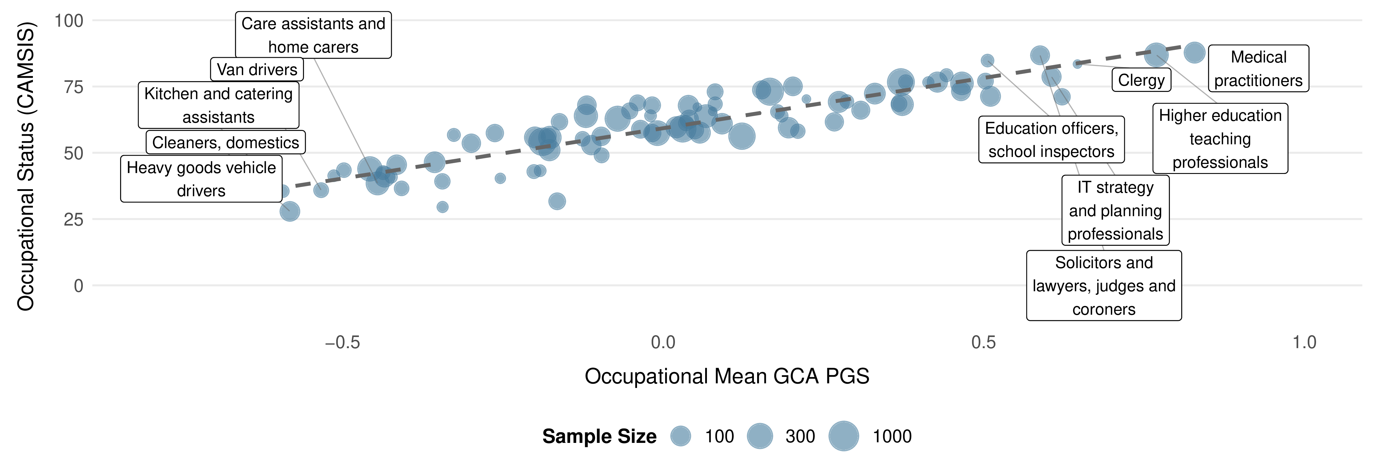 The occupational gradient becomes particularly clear when you zoom out from sibling pairs to the full UK Biobank. Averaging CogPGT scores by occupation reveals a systematic stratification that closely tracks the cognitive demands of different professions and is highly correlated with occupational status, as sociologists measure it: medical practitioners, academics, IT professionals, and lawyers cluster at the top, while manual and service occupations cluster at the bottom. None of this is new as a finding about intelligence and work. That relationship has been documented extensively, in part by people on our team. What is new is that a polygenic score constructed from DNA alone recovers the occupational hierarchy with this degree of resolution.